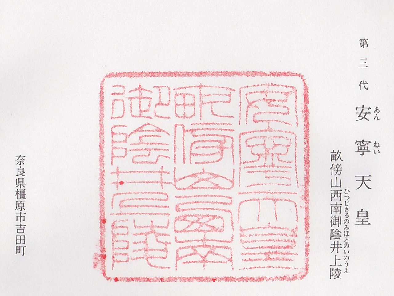 延喜諸陵式: 畝傍山西南御蔭井上陵 片鹽浮穴宮御宇安寧天皇 在大和國高市郡 兆域東西三町南北二町 守戸五烟 遠陵