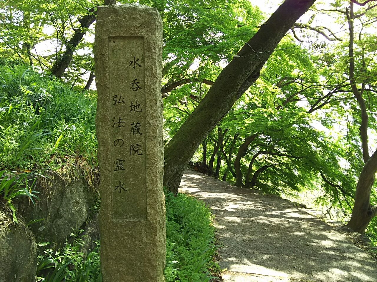 地蔵堂を過ぎると間もなく民家は途絶え、山道となる。晩春の空は晴れ渡り、その日差しに新緑が目映く輝いている。