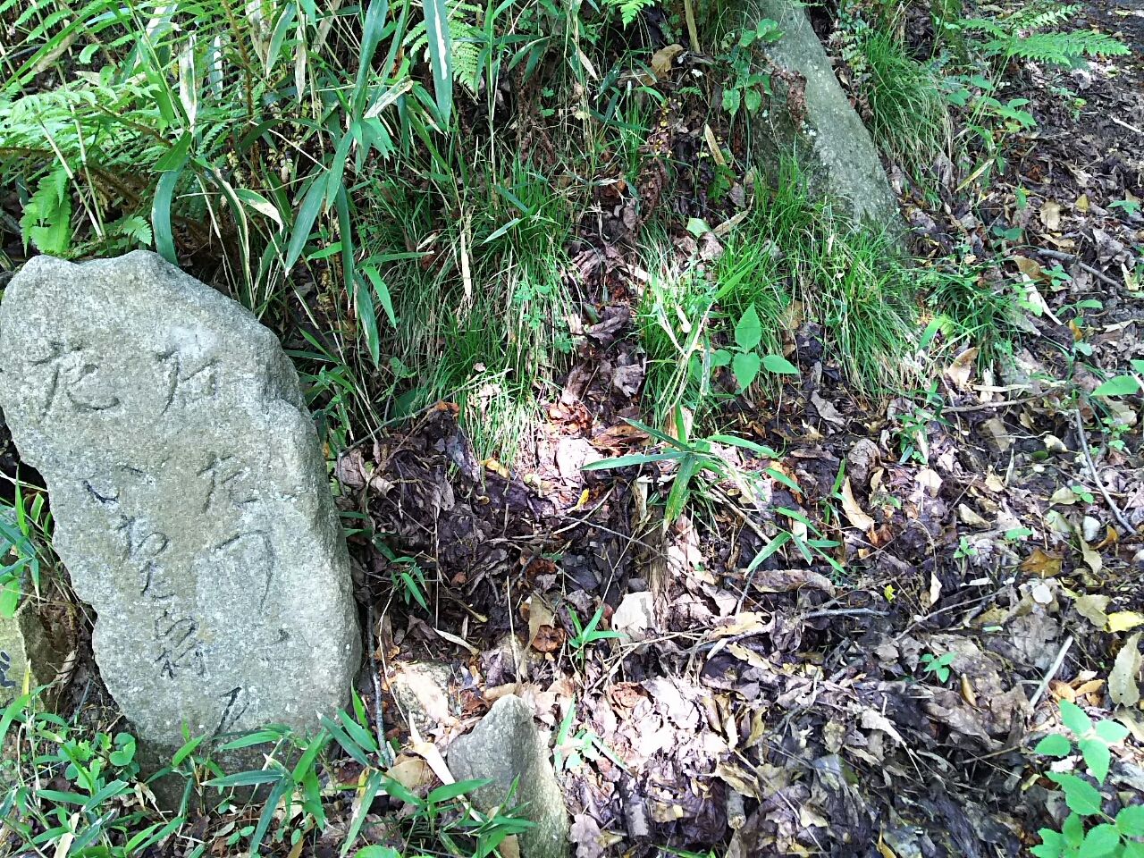 自然石に彫ったらしい小さな道標が目に入った。「右 たつの 左 いちはら村」と読める。道標がなければ気づかなかっただろうが、ここで道が分岐しているらしい。しかし左の道は草に覆われていて先へ進めそうにない。後でわかったことだが、この道は櫟原越え(河内越え)と称し、十三峠を越えた先の福貴畑の北に位置する櫟原へと続く道だが、今は廃道同然とのことだ。