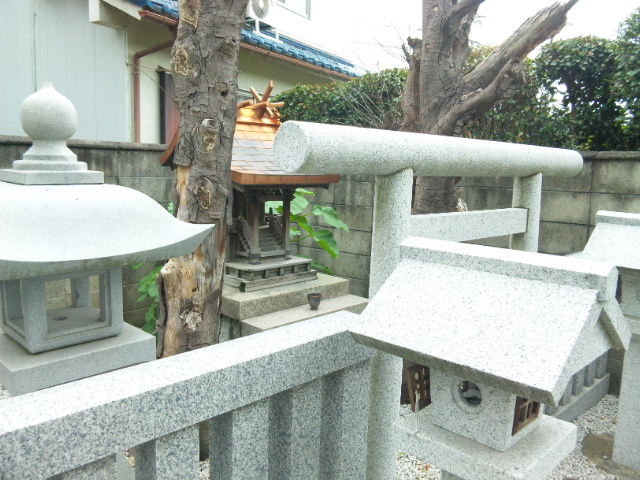 中央拝殿の向かって右には倉稲魂命(稲荷大神)を祀る賢岡神社。奇妙なことに、鳥居の扁額には「吉岡大明神」、社殿前の駒札には「賢岡大明神」とある。「かたおか」の地名を冠していること、境内社の中で一社だけ独立して祀られていることから考えると、地主神のような位置づけなのかもしれない。