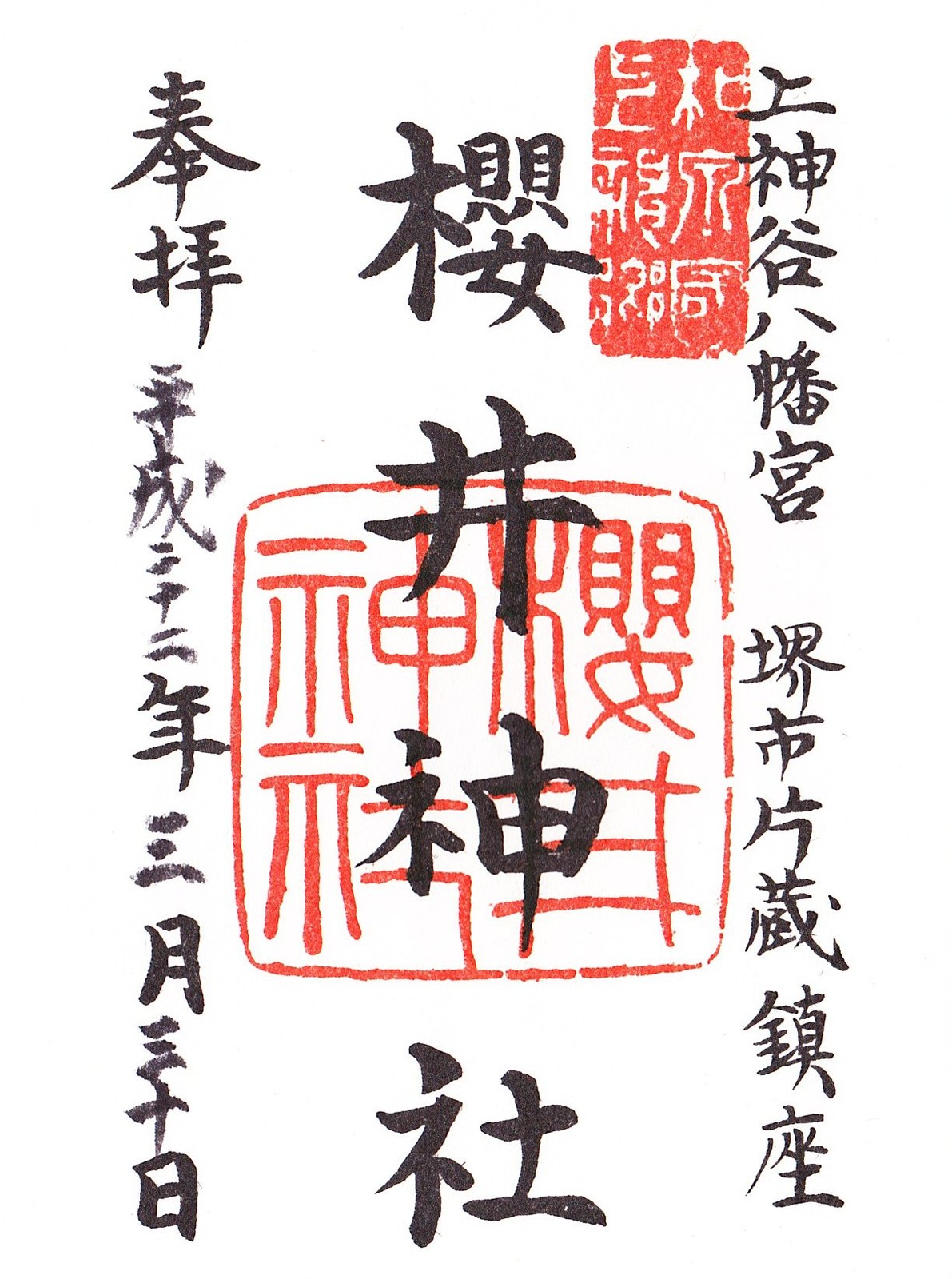 上神谷八幡宮とも称するのは、推古天皇五年(597)八月八日、西北の空から八幡神が櫻井神社の杜に示現、郷民はこれを喜び、神祠を建てて八幡神を併せ祀ったことによる。神が降臨したとされる石が瑞垣内の本殿向かって右の傍らにある。