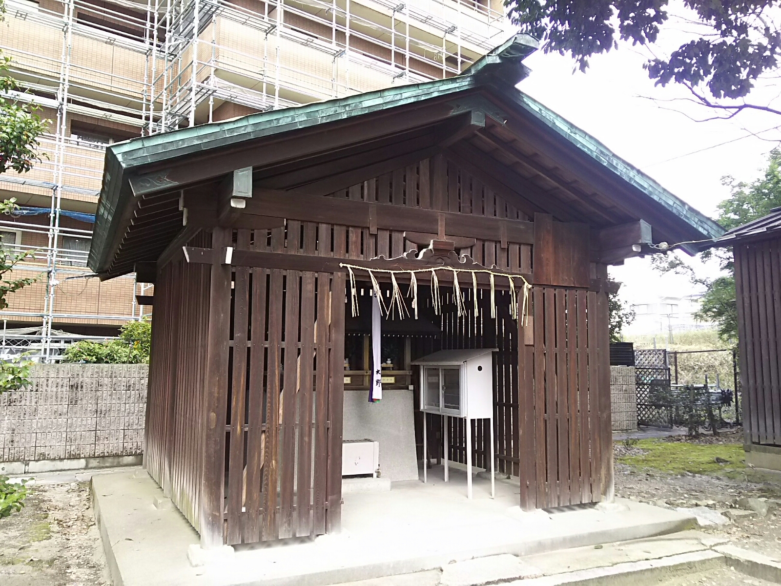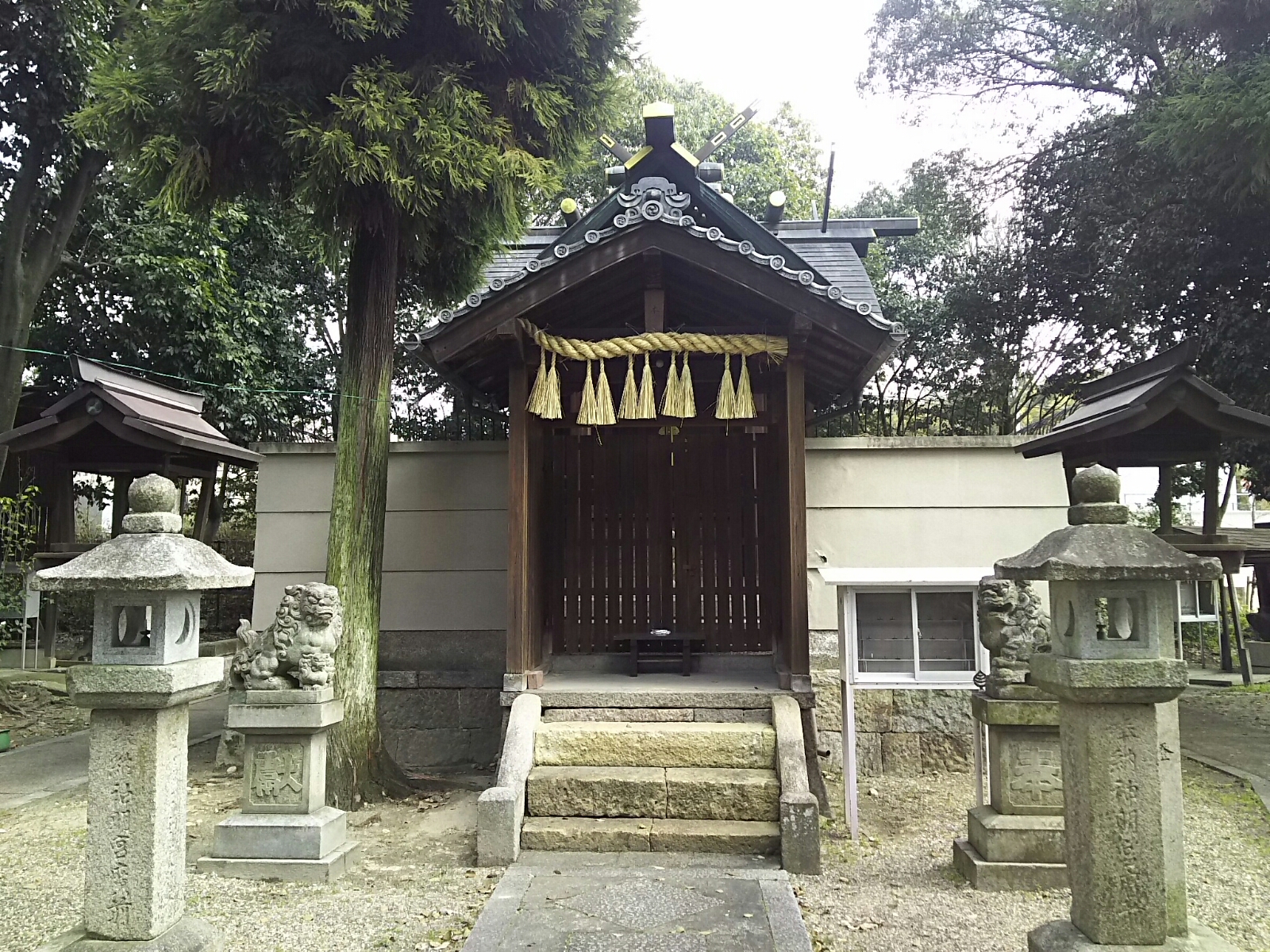 左手前の覆屋の中に三社。中央に春日社、向かって右が住吉社、左が天満宮。