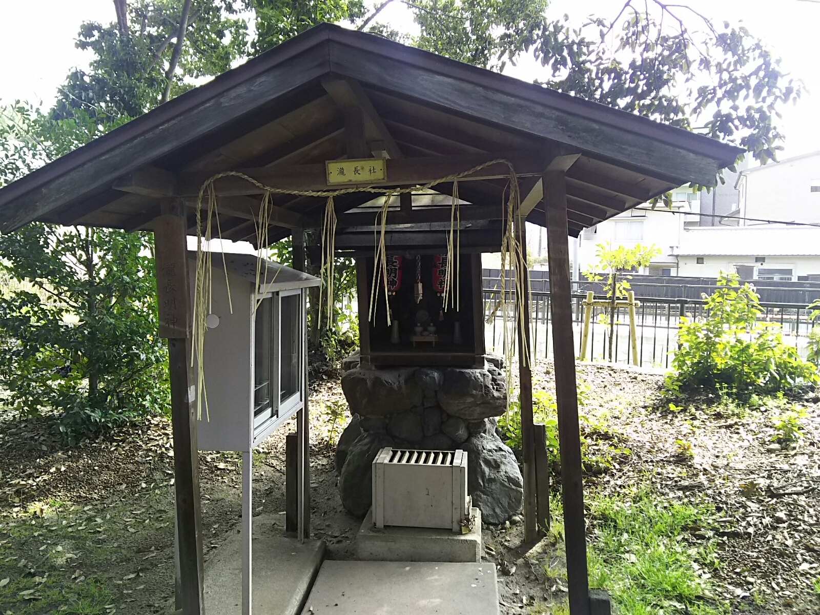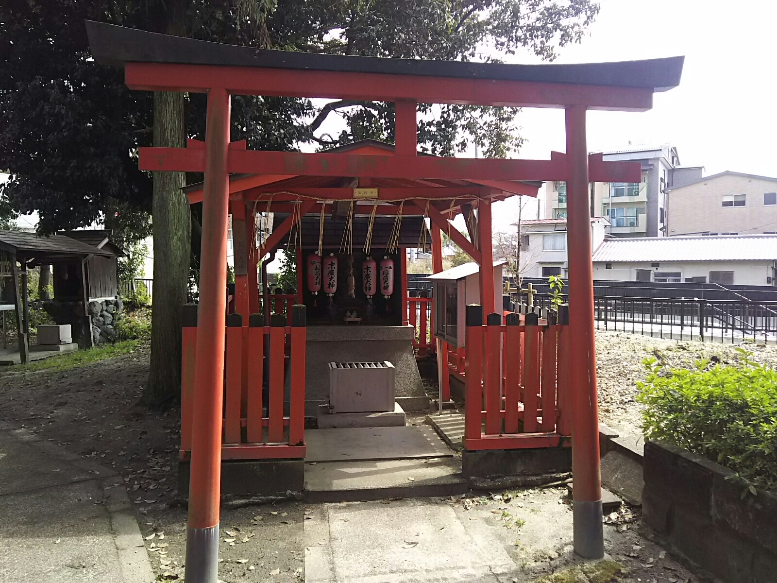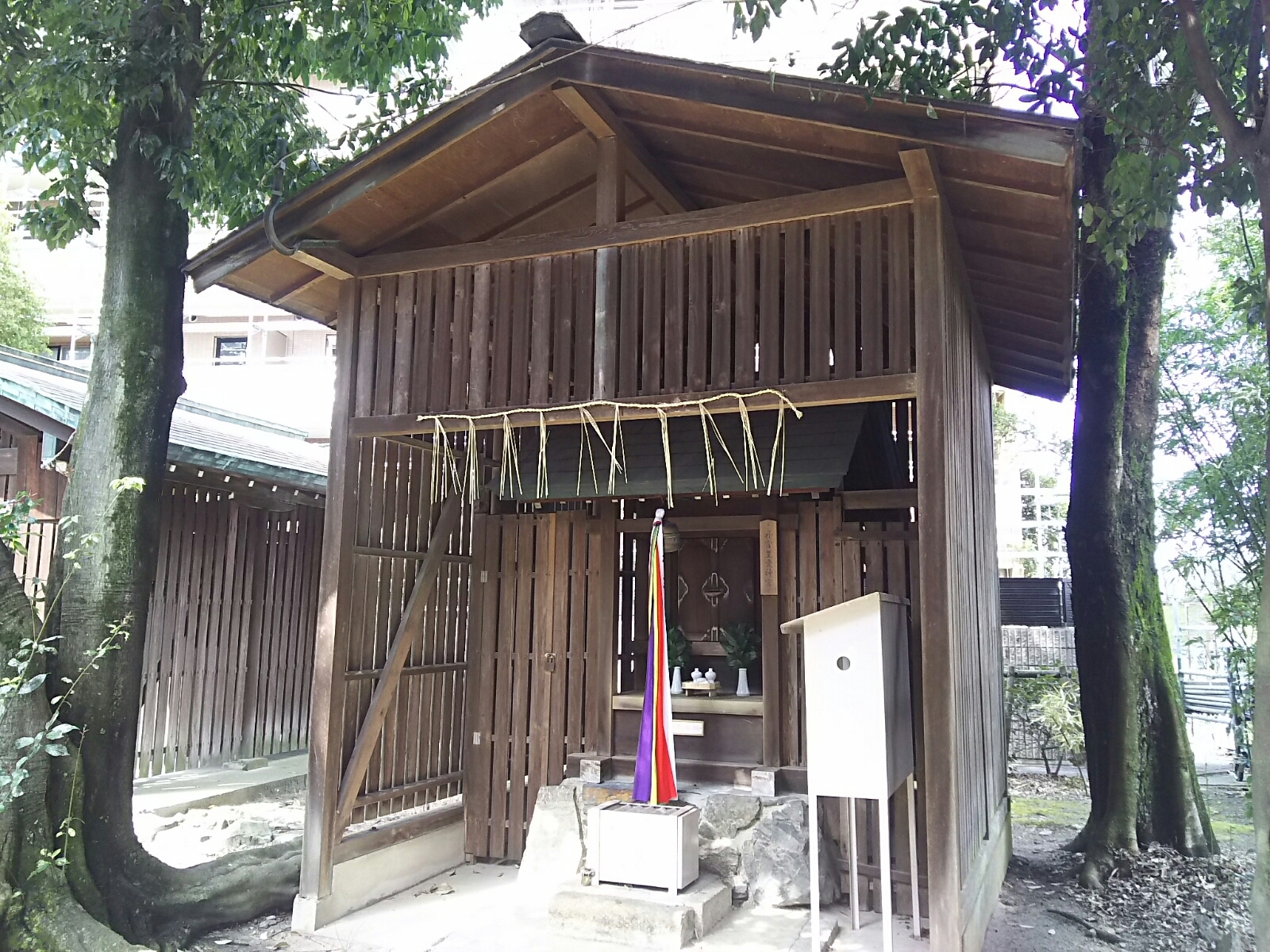 本殿背後に伊勢神宮遥拝所、「水の神 瀧長明神」という木札のある瀧長社、そして朱の鳥居が設えられ「稲荷山 末廣明神」の木札と「稲荷大神」の扁額が掲げられた稲荷社。